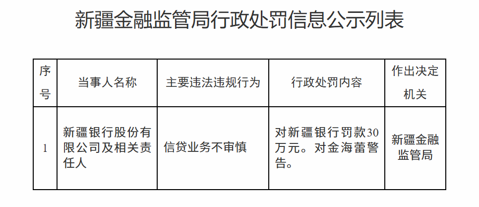 4月13日,新疆金融监管局行政处罚信息公示列表显示,新疆银行股份有限公司因信贷业务不审慎被罚款30万元。责任人金某蕾被警告。