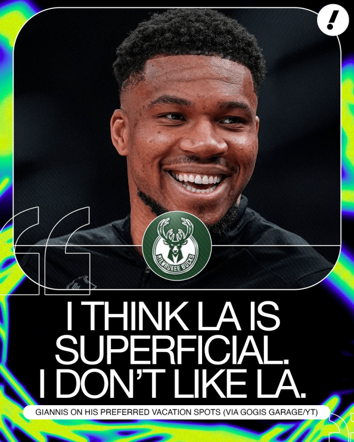 在谈到自己偏好的度假地点时,字母哥表示:“我觉得洛杉矶太浮夸了,我不喜欢洛杉矶。”